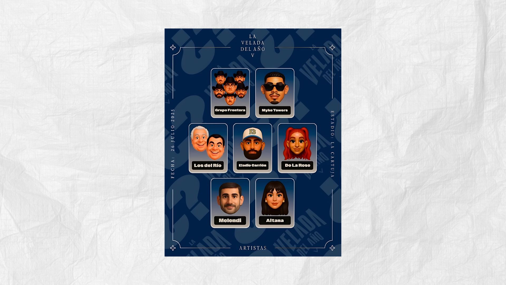 Ibai Llanos anunció el cartel completo de artistas que se presentarán en La Velada del Año V, el próximo 26 de julio en el estadio La Cartuja de Sevilla. Los shows musicales estarán a cargo de: