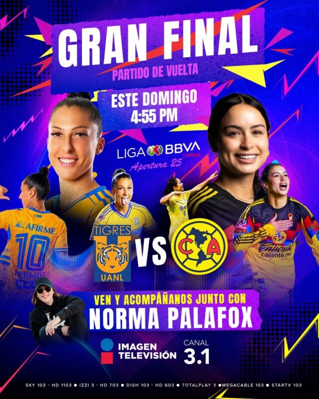Este domingo 23, Imagen Televisión transmitirá la final de vuelta de la Liga MX Femenil entre Tigres y América. La emisión comenzará a las 16:55 horas a través del canal 3.1 de televisión abierta.