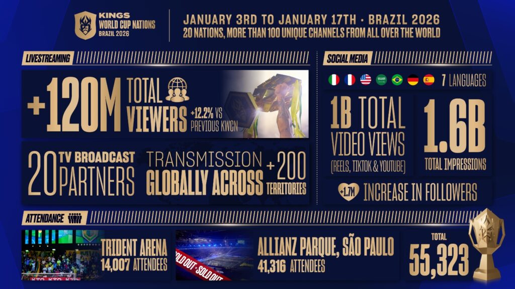 La Kings World Cup Nations 2026 estableció nuevos registros de alcance digital y consumo en streaming para el ecosistema Kings League, al concentrar más de mil 600 millones de impresiones en redes sociales y sumar 120 millones de espectadores acumulados en transmisiones en línea. El torneo se posicionó como el evento de mayor impacto de la propiedad desde su creación, de acuerdo con cifras difundidas tras el cierre de la competencia.